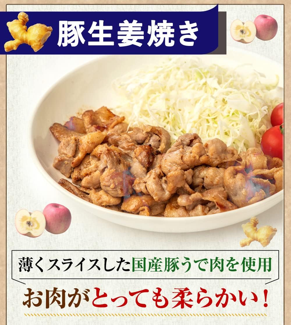 【豚ショウガ】豚肉(国産)、醤油、糖類(砂糖、砂糖混合ぶどう液糖)、みじん切り生姜、味噌、生姜加工品、りんごピューレ、はちみつ、食塩/調味料(アミノ酸等)、酒精、増粘多糖類、酸味料、PH調整剤、酸化防止剤(V.C)、(一部に豚肉・小麦・大豆・りんごを含む) 【豚ロース味噌漬け】豚肉(国産)、味噌、糖類(砂糖、水飴)、醤油、発酵調味料、赤ワイン、唐辛子、食塩/調味料(アミノ酸等)、増粘剤(加工でん粉)、酒精、着色料(ベニコウジ色素、パブリカ色素、カロテン色素)(一部に豚肉・小麦・大豆を含む) |